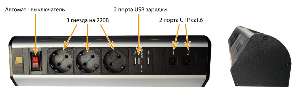 Настольный мультимедийный блок предназначен для установки непосредственно на рабочем столе пользователя. Изделие устанавливается на столешницу рабочего места при помощи 2х струбцин, входящих в комплект. Блок подключается к электросети 220В кабелем 3х1,5мм2, оконцованным вилкой Schuko (Гибридный тип E / F, CEE 7/7 Французско-Немецкий 16 А/250 В, с заземлением, согласно ГОСТ 7396.1-89 - тип С4). Подключение портов RJ-45 cat.6 осуществляется через повторители портов к шнурам существующей СКС здания. Лицевые панели установленных в блоке повторителей оснащены площадками под маркировку и защитными шторками на гнездах. Блок оснащен модулем на 2 порта для USB зарядки электронных устройств. Общая сила тока до 2,4 А. Корпус блока выполнен из анодированного алюминия. Торцевые крышки из АБС черного цвета.