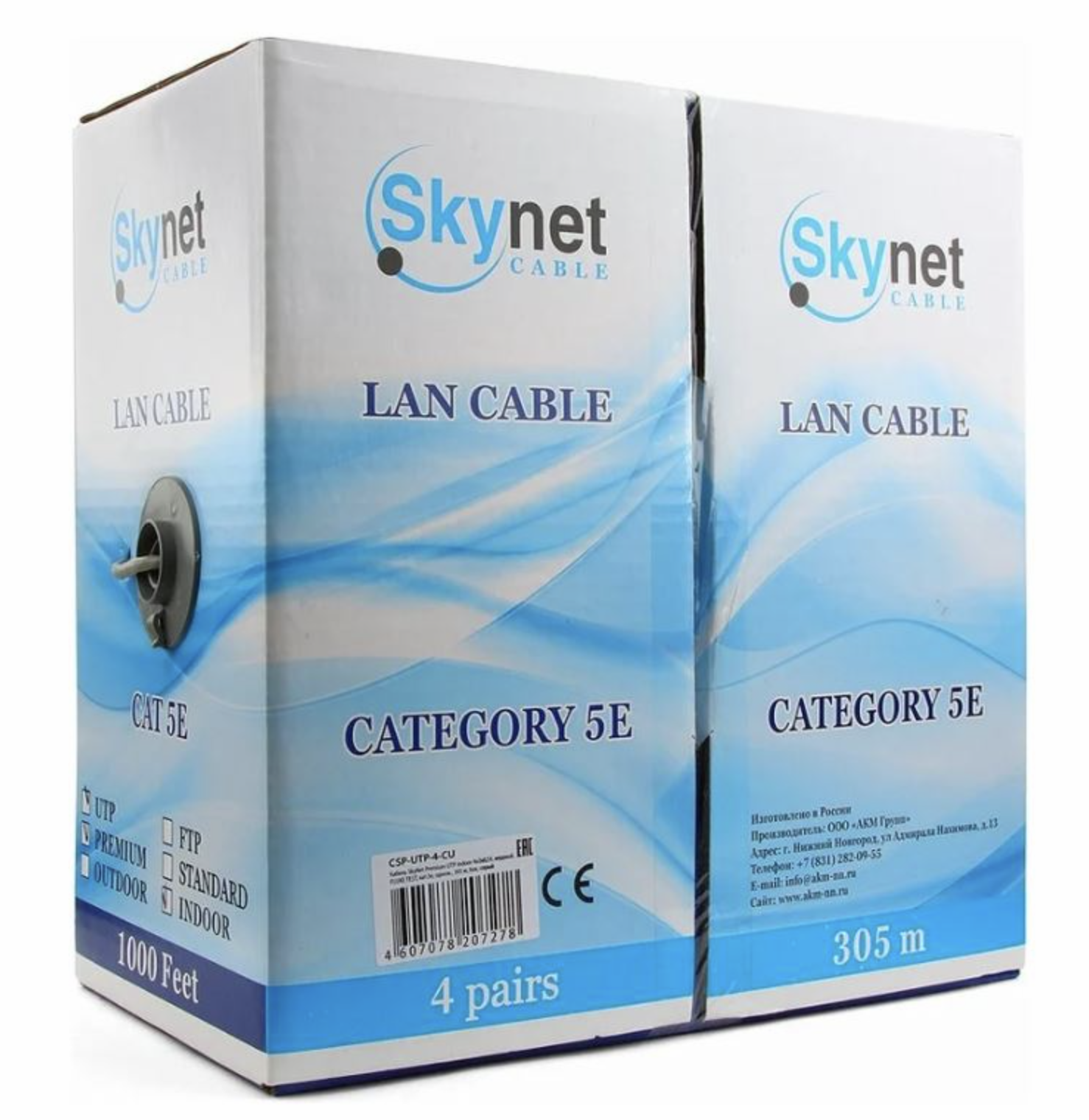 Витая пара SkyNet промаркирована по оболочке кабеля с указанием на соответствующий стандарт, поставляется бухтами по 305 метров, которые упакованы в жёсткие картонные упаковки для обеспечения надежности хранения, транспортировки и удобству монтажа.