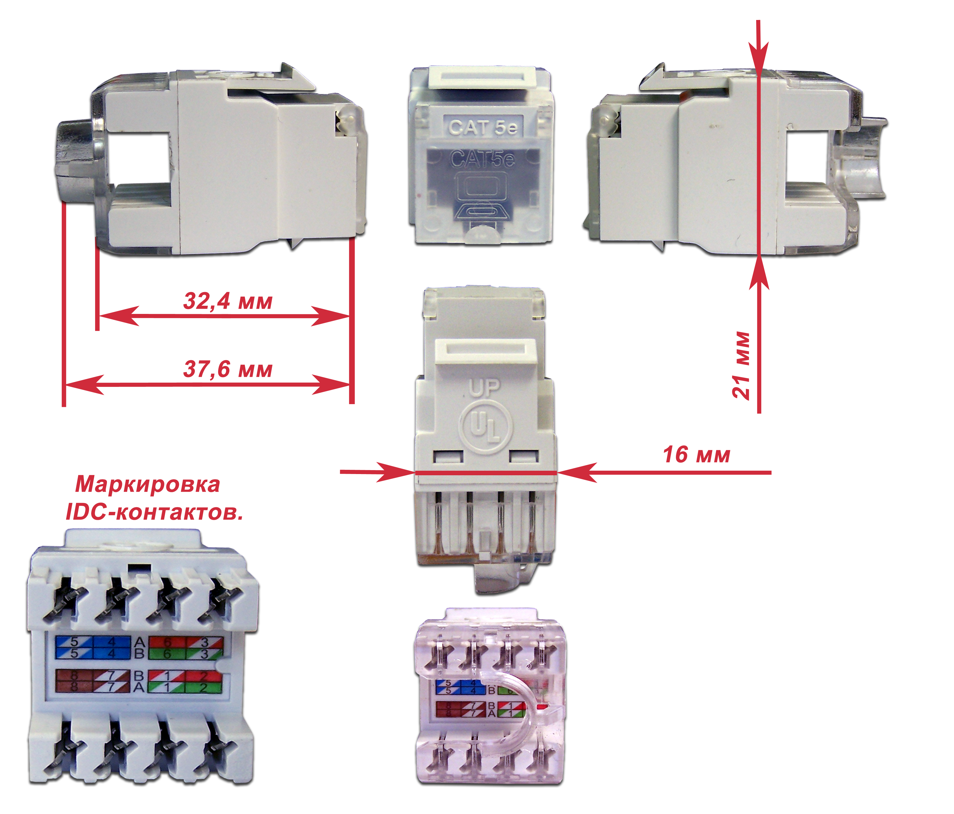 Модуль может использоваться для комплектации неэкранированных телекоммуникационных розеток, устанавливаемых в короб, на стену, в стену, а также для установки в наборные патч-панели (см. таблицу совместимости). Соответствует требованиям категории 5E. Модуль имеет стандартный типоразмер Keystone и может использоваться не только в розетках LANMASTER, но и в розетках других производителей. На лицевой стороне модуля смонтировано восьмиконтактное гнездо типа RJ-45, с обратной стороны установлен блок на восемь контактов типа IDC110, расположенных под углом 180˚ к лицевой поверхности модуля. Для подключения абонентских кабелей используется способ врезного контакта сквозь изоляцию - IDC. Для удобства монтажа, между разъемами IDC расположена схема подключения проводников кабеля, в соответствии со схемами T568A и T568B. Каждый модуль комплектуется защитной вставкой, обеспечивающими дополнительную фиксацию проводников кабеля, затерминированных в IDC-разъемы, и предохраняющие их от выдергивания при чрезмерном натяжении кабеля. В комплект поставки также входит съемная крышечка, предохраняющая контакты модуля от попадания пыли, грязи и механических повреждений при использовании этого модуля в наборных панелях или с лицевыми вставками, не имеющих своих защитных шторок. ![]() |