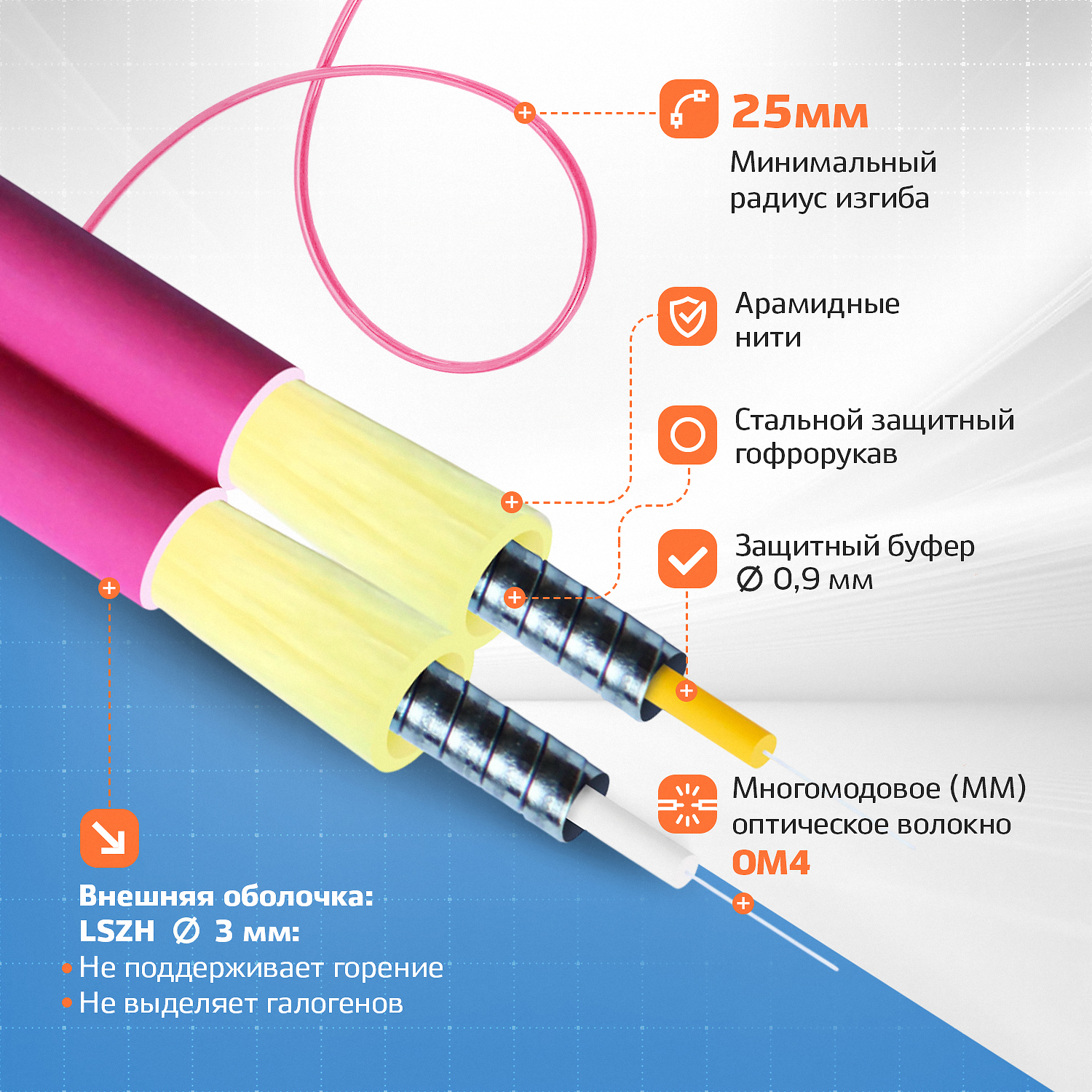 В основе многомодового армированного кабеля Duplex лежат: жилы оптоволокна типа OM4 (Multimode), а также гофрированная стальная трубка и арамидные нити, увеличивающие прочность кабеля