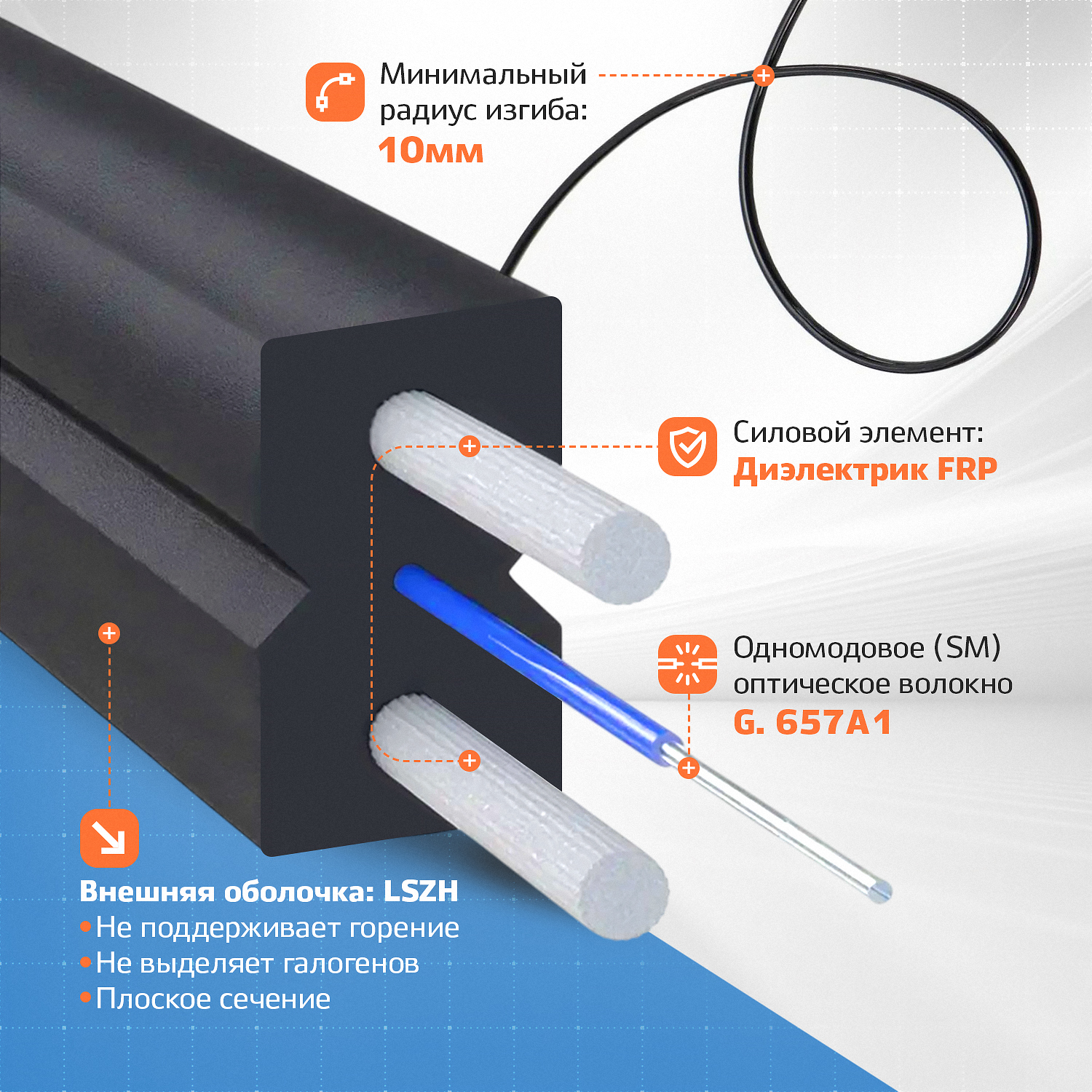 Он применяется в сетях FTTH и PON, где требуются минимальные внешние диаметры оболочки и защита волокна от климатических и механических воздействий