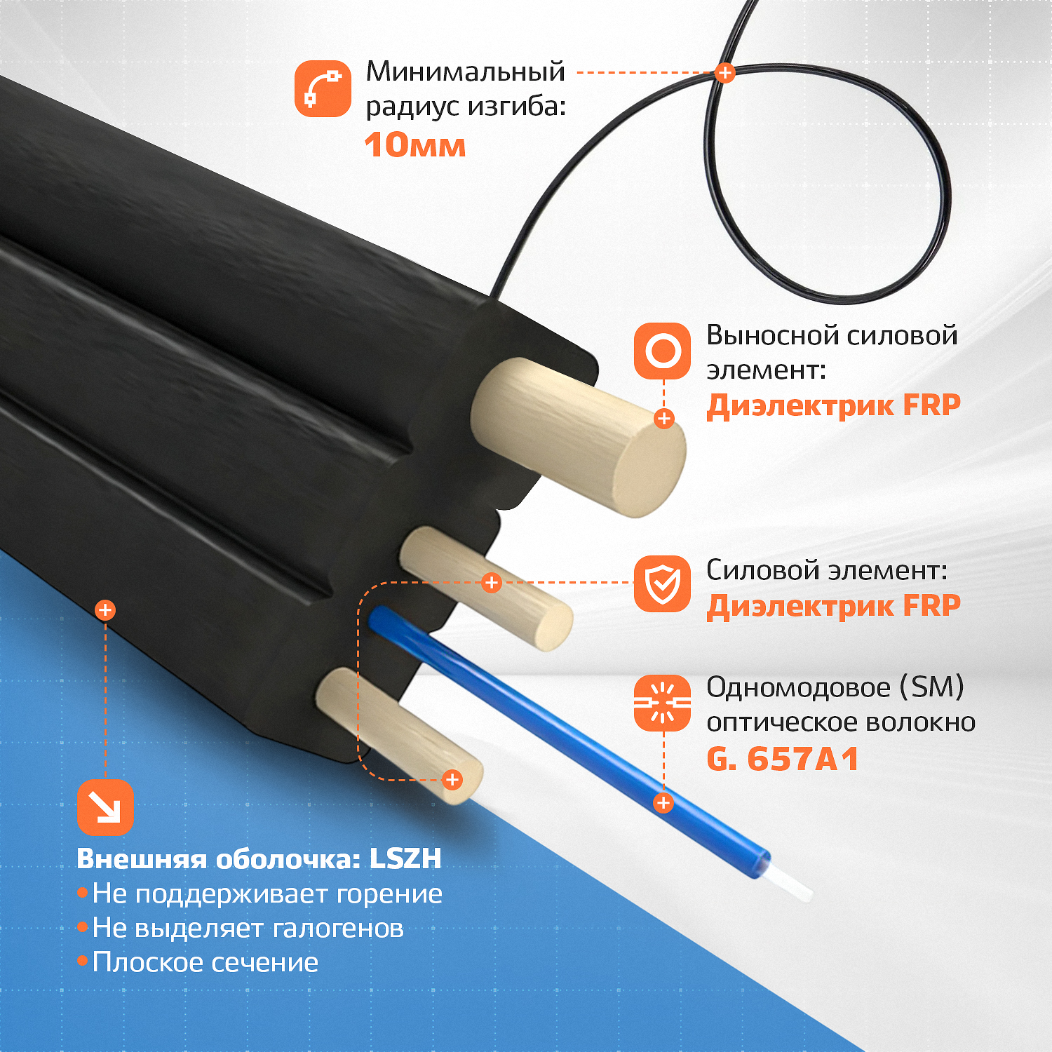 Кабель оптический CO-FTTH1-2 с выносным силовым элементом (LSZH, 2SC/UPC, черный, 50 м) – это волоконно-оптический кабель, предназначенный для подключения активного сетевого и абонентского оборудования в оптических линиях связи