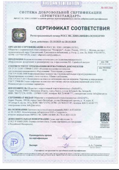 Данные коммутационные шнуры изготавливаются только из качественных комплектующих и проходят строгий контроль качества на производстве, что сводит к минимуму вносимые затухания