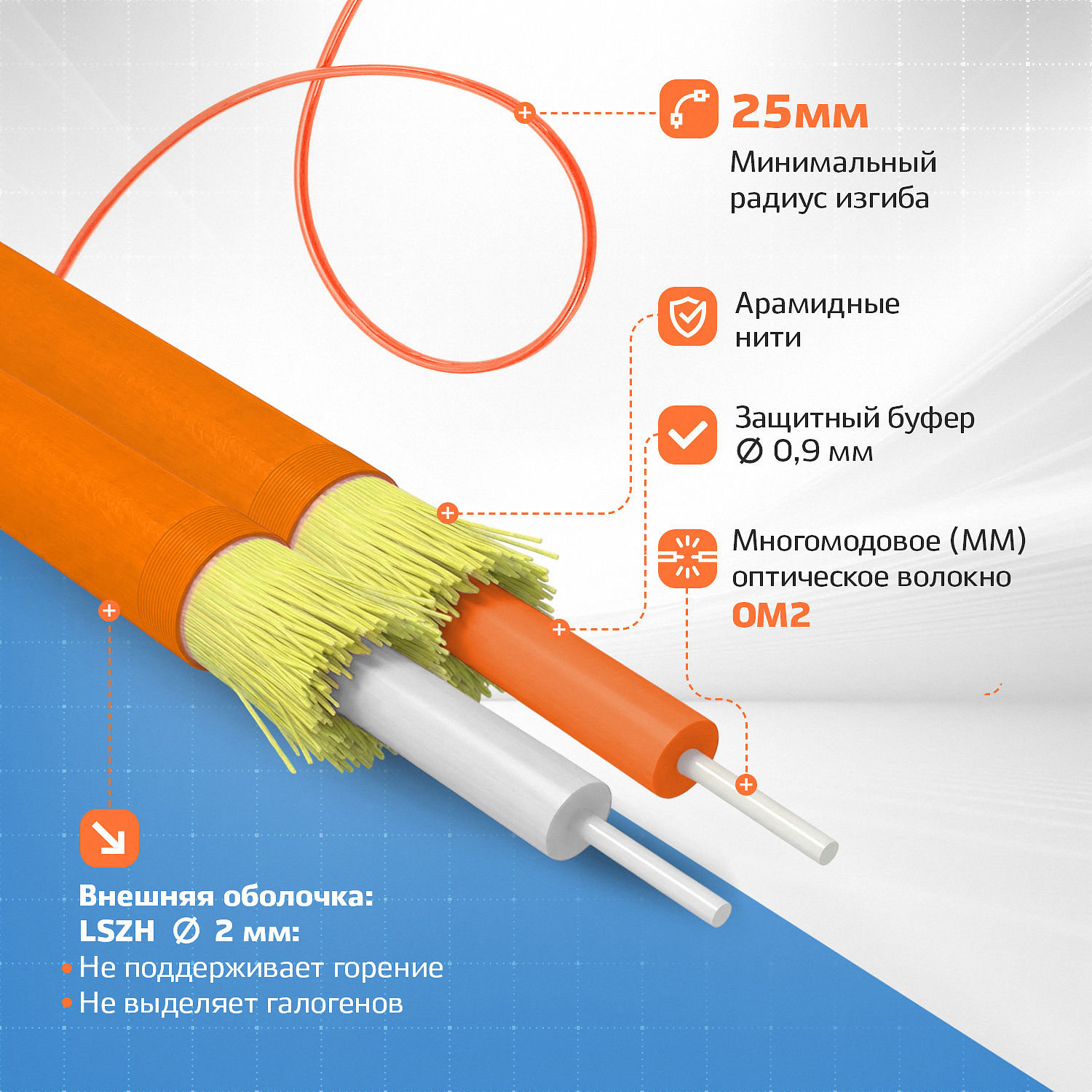 В основе многомодового кабеля Duplex лежат жилы оптоволокна типа OM2 (Multimode)