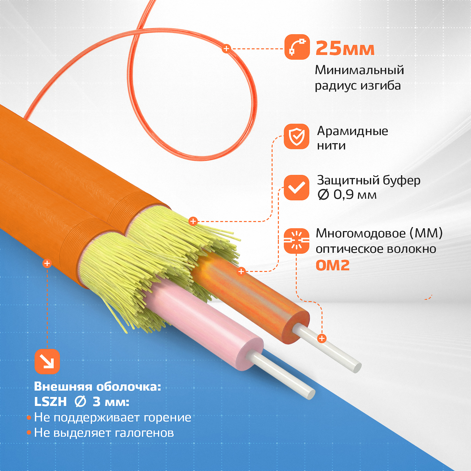 В основе многомодового кабеля Duplex лежат жилы оптоволокна типа OM2 (Multimode)