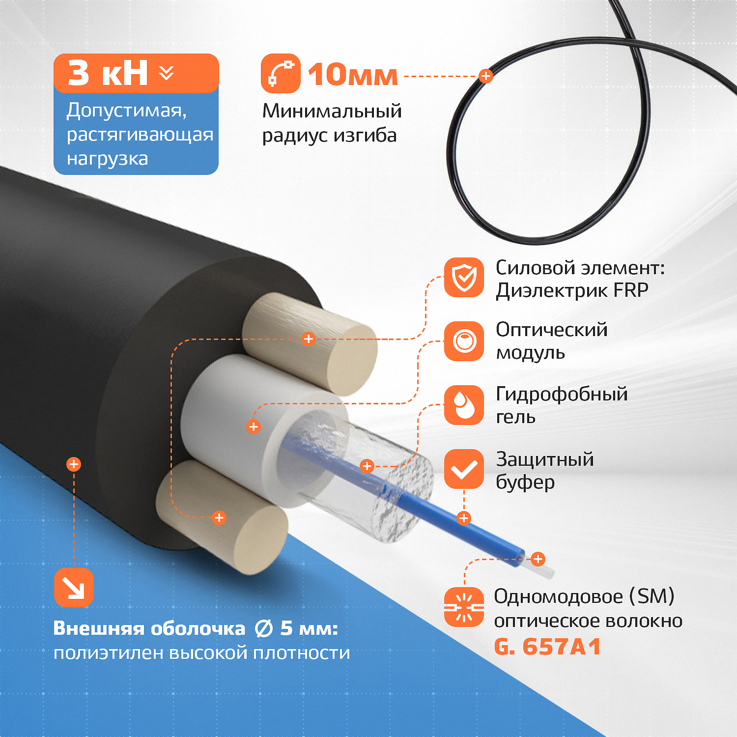 В основе самонесущего дроп-кабеля лежат: оптоволокно типа G.657, диэлектрик FRP и термоусадочная трубка, обеспечивающая надёжное крепление кабелей разного диаметра