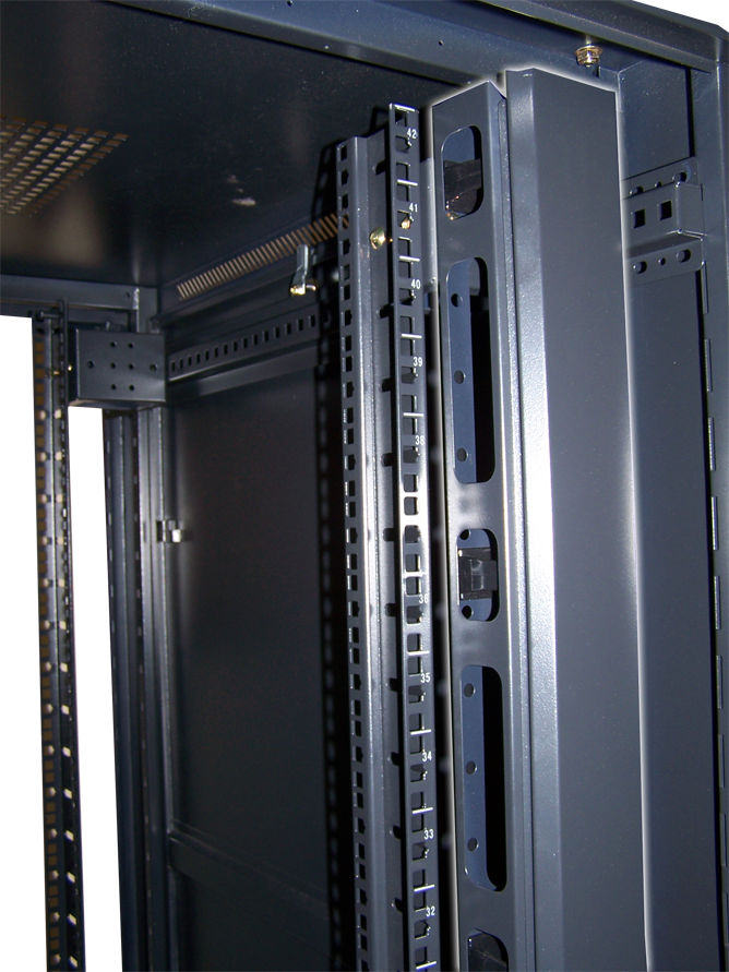 Шкаф комплектуется регулируемыми опорами для компенсации неровностей пола и поворотными роликовыми опорами для обеспечения возможности перемещения. Возможна установка шкафа на дополнительный цоколь. В этом случае ножки шкафа переносятся в цоколь. Опоры устанавливаются в резьбовые отверстия М12 в цоколе. Возможно соединение шкафов друг с другом с помощью специального комплекта для соединения шкафов. Шкаф поставляется в разобранном виде. На 19” направляющих (экструдерах) нанесена маркировка юнитов. Цвет – черный (RAL 9004) Максимальная нагрузка составляет 800 кг. Степень защиты – IP 20 Окраска – порошковое напыление. Комплект поставки: две отдельно упакованные рамы, коробка с дном и крышей, коробка с боковыми дверями. коробка с вертикальными органайзерами. Шкафы соответствуют международным стандартам ANSI/EIA RS-310-D, IEC297-2, DIN41494; PART1, DIN41494; PART7, ГОСТ 14254 |